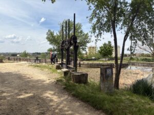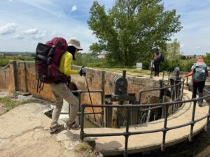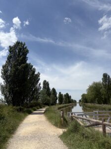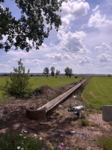 フロミスタまで、カスティージャ運河沿いを進みます。この運河ではボートに乗ることもできるそうです。ここで初めてコウノトリの鳴き声を聞きました。左側には畑が広がっています。運河から水を引き入れているのであろう、水路もありました。
