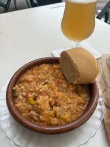 豚のリゾットとビール。味は…普通でした。レトルトかな、って感じ。