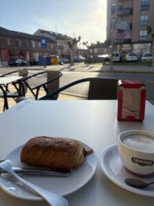 町で朝食を食べてから出発する派の人たちが歩きはじめる頃です。すれ違うたびにブエンカミーノと声をかけながら、私はバス停近くまで戻ってきました。時間があるのでバルのテラス席で朝食。ナポリターナ(パンオショコラ)とコーヒーをのんびりいただきます。まだ9時前。ここからバスの時間まで町ゆく人々を観察しながらひたすらじっと待機です。