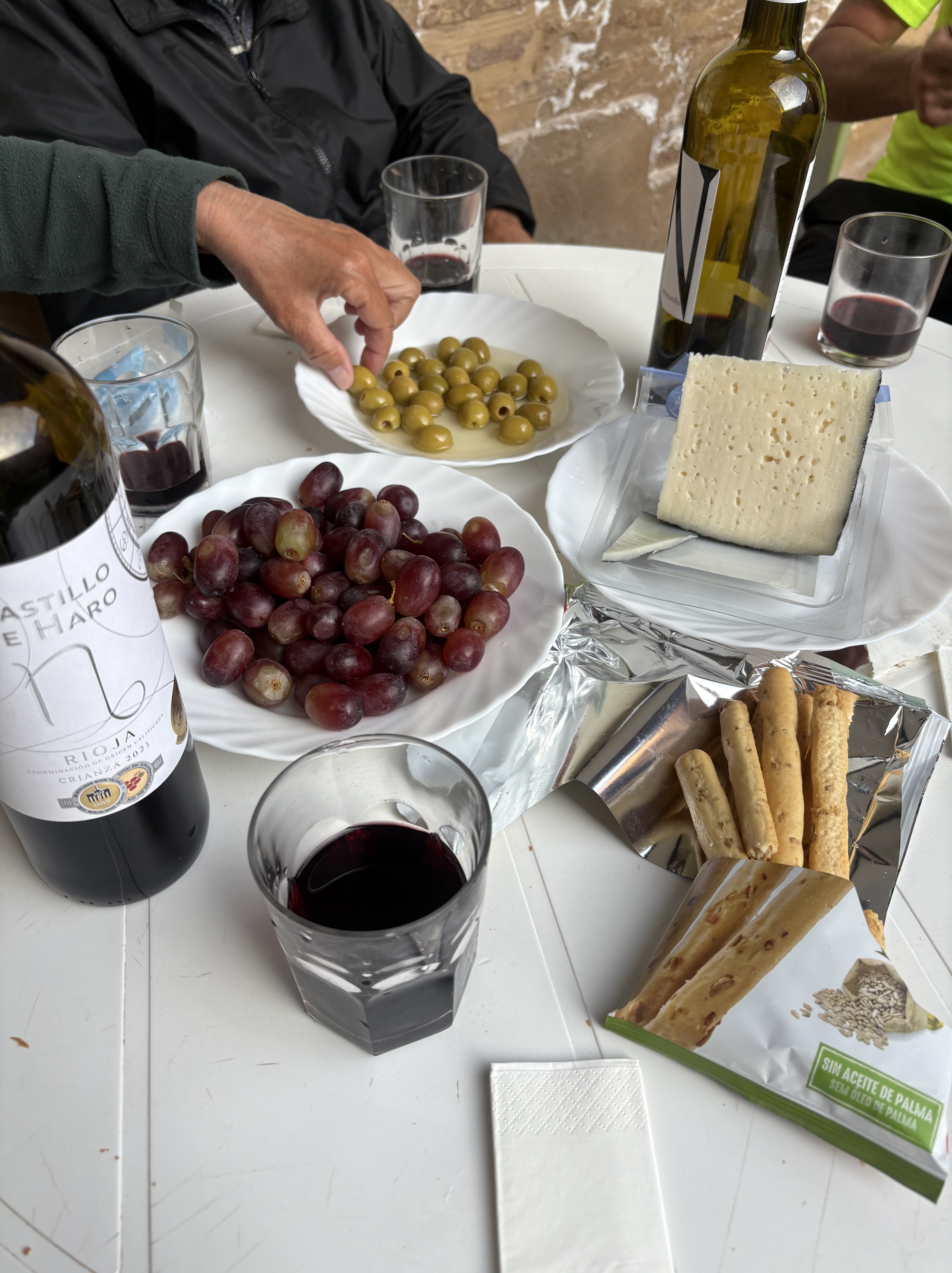お昼寝をしてシャワーをあび、夕方にジギと近くのスーパーへ。お昼にたっぷりと食べてお腹が減っていなかったので(今日は運動もしていないし)、宿の持ち寄りディナーには参加せず、庭で軽くつまむ程度にしようということになりました。チーズや果物、ワインを買って中庭へ。ヤンと3人で食べていると、スペイン人とドイツ人の男性も参加し、5人で乾杯。スペイン人の彼は自転車で巡礼中。なんと11回目のカミーノだとか!就寝時間まで外でおしゃべりを楽しみました。