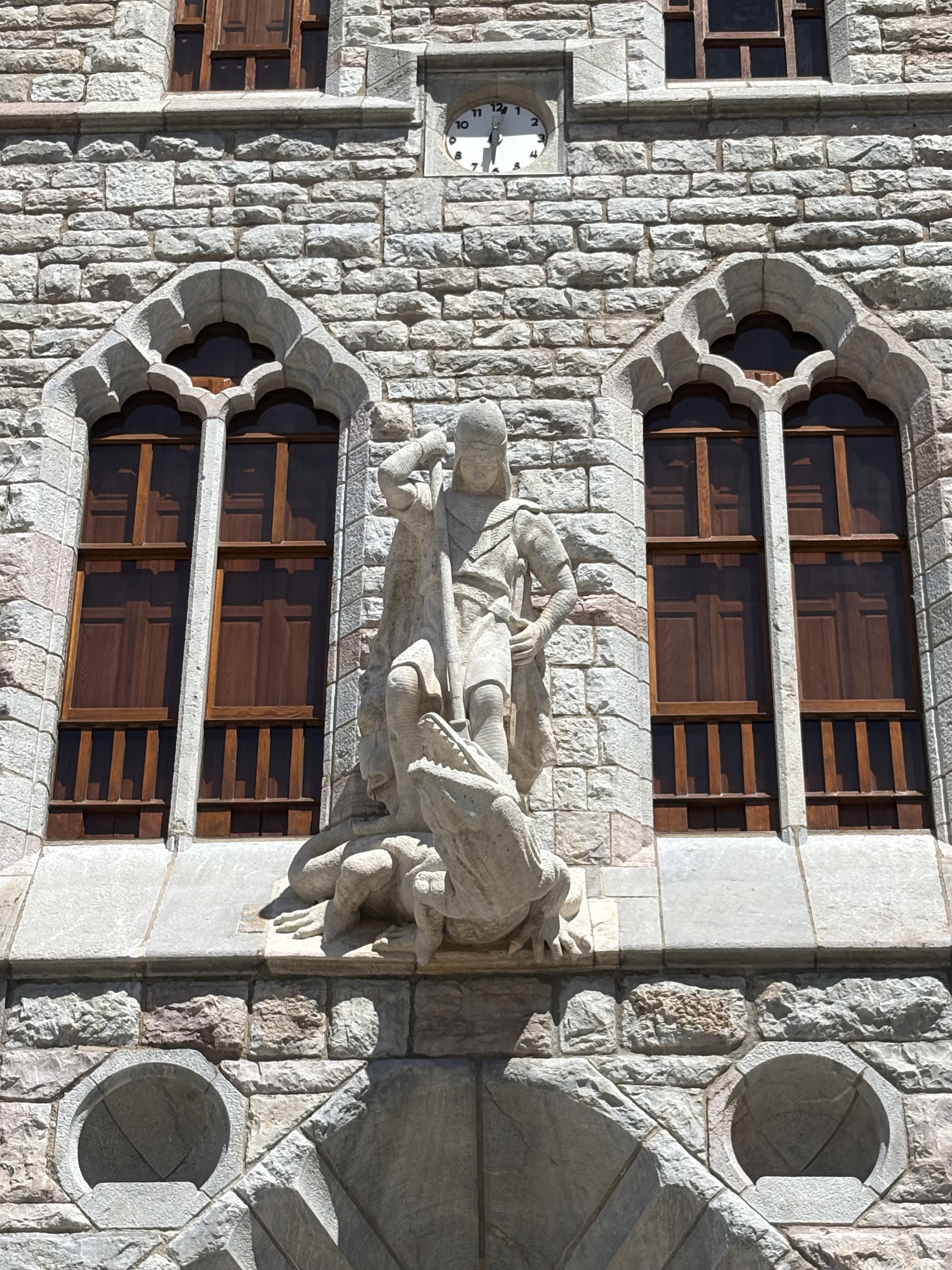 窓から外壁やドラゴンを倒す聖ジョージの彫刻を近くで見ることができます。(私はワニだと思っていた。)