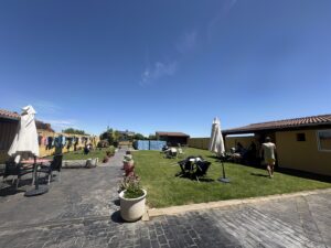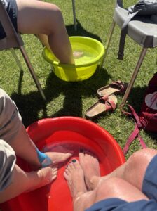宿に戻り、洗濯をして広い庭でまったりタイム。シャーロットも同じアルベルゲに到着したので、皆で明日からのスケジュールを相談して過ごしました。宿で氷を借りたので私はおしゃべりしながらアイシングもします。ちなみにこの氷、私からお願いする前に、アルベルゲのママさんが私の足をみて「アイシング用の氷が必要?」と話しかけてくれました。さすが、わかってる!ありがたい!さらに皆でバケツに水を張って、疲れた足をつけて癒やしました。ポカポカ陽気に冷たい水、気持ちよかった!