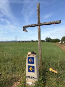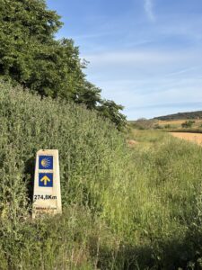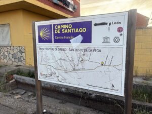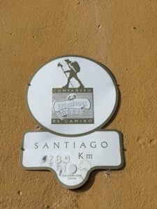 壁に付けられているタイプのサンティアゴまでの距離標識を発見。かわいい。