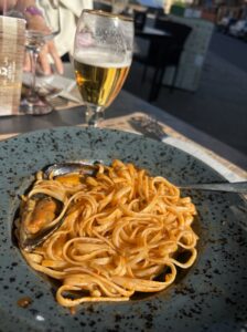 しばらくベッドで休んでから、夕食のため再び町へ。ジギとシャーロットと3人で、お昼に見つけておいたバルへ向かいます。海の幸パスタ、お値段なんと6.9ユーロ!安い!