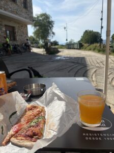 あと2㎞でオ・セブレイロというところで町にでたのでバルで少し休憩。時刻は10:45、ランチには早いけどお腹がすいたので宿で持たせてくれたピザをここで食べます。マリエさんにも1枚おすそわけ。う〜ん、おいしい!