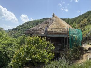町を散策。この修繕中の家の下におりると売店がありました。最低限のものはここで販売しているようです。明日のために水などを購入。昔ながらの家のスタイルは日本の茅葺屋根のようです。