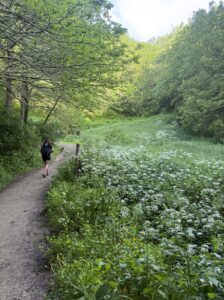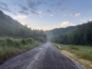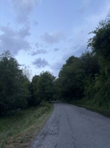 スタートから登り坂です。雷は去ったとはいえ、まだ空はピカピカ光っていて、向こうの方でゴロゴロ音が鳴り響いています。どんより曇り空、びびりながら雷雲を追いかけるように歩きはじめました。