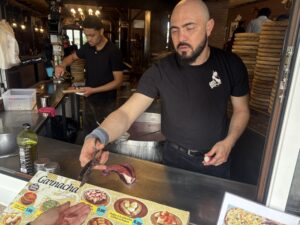 店頭でパフォーマンスをしていました。お皿のサイズによってお値段が変わるようです。この時間からタコ、食べれるかなぁ。ということで、一番小さなサイズのさらに半分の量にしてもらえるなら食べたいんだけど、まだ朝だし私はひとりだし、とお兄さんに交渉。仕方ないな、オッケー、ということで入店。
