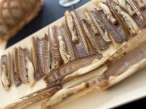 ということで早めディナーのため、さきほど散策しながら見つけておいたレストランへ。ずっと気になっていたマテ貝を注文。高いからなかなか手を出せなかったんだけど、せっかくなのでいただくことに。白ワインとパンが合うと言われたので、勧められるがままにいただく。