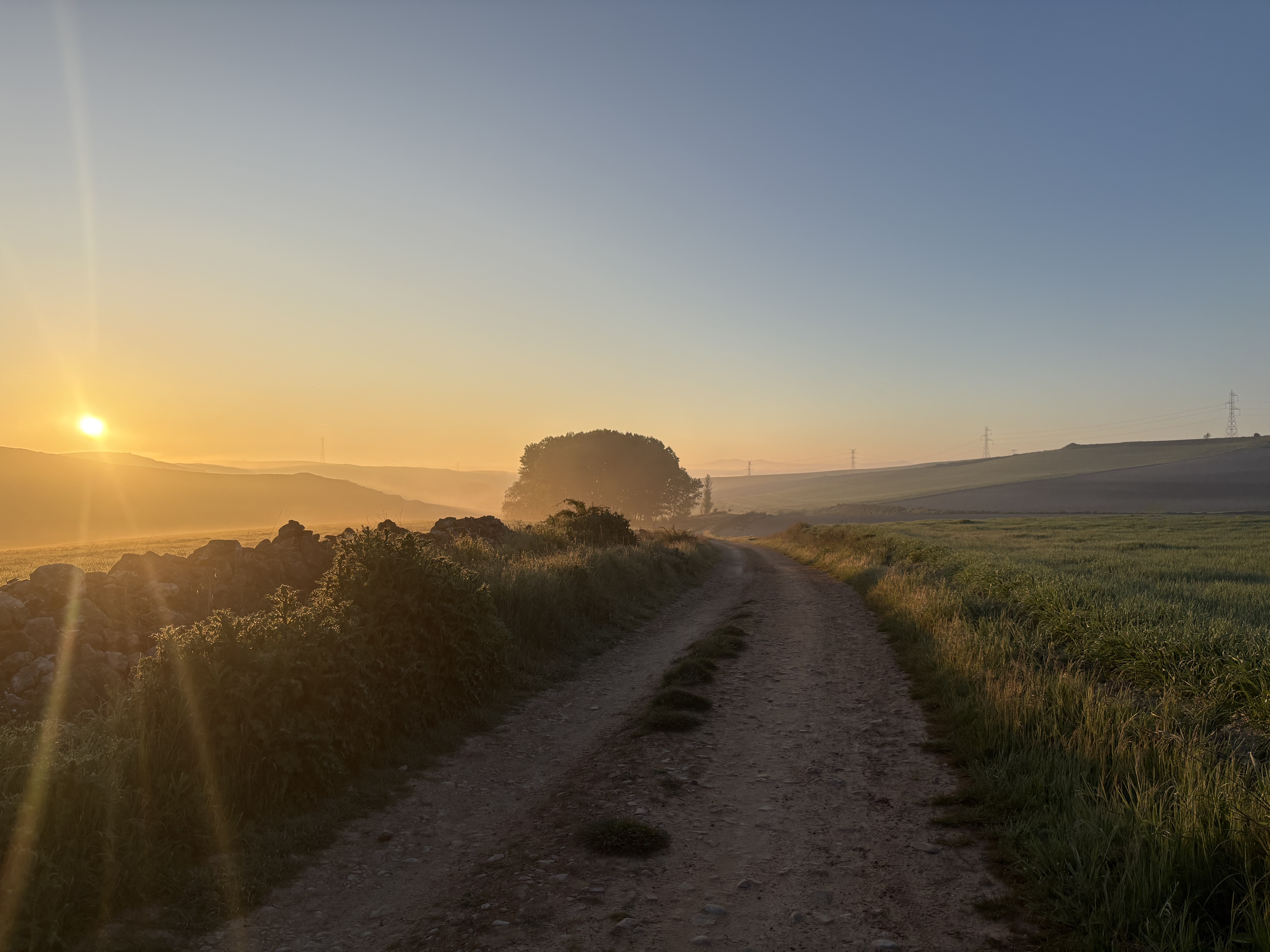 朝はまだ暗いうちに起き、荷物の準備やストレッチをしてから、日が昇る6〜7時頃に出発することが多かったです。歩き始めると空が明るくなり、巡礼者やカフェも動き出します。